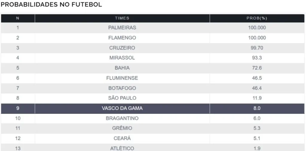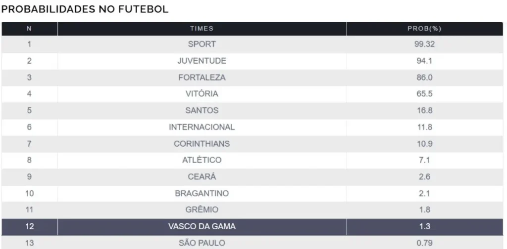 Chances de rebaixamento do Vasco são de praticamente zero – Foto: Projeto Probabilidades do Futebol/UFMG
