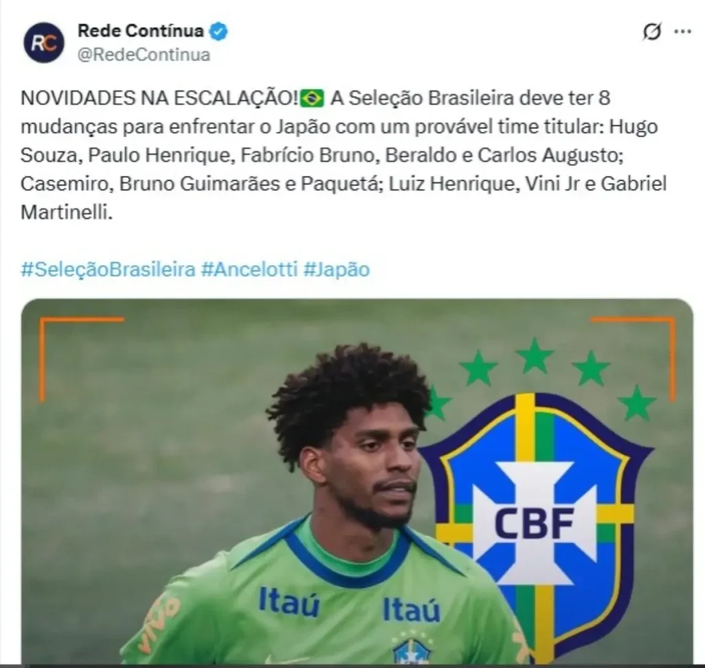 Ancelotti promove várias mudanças no time titular da Seleção Brasileira – Foto: Rede Contínua/X