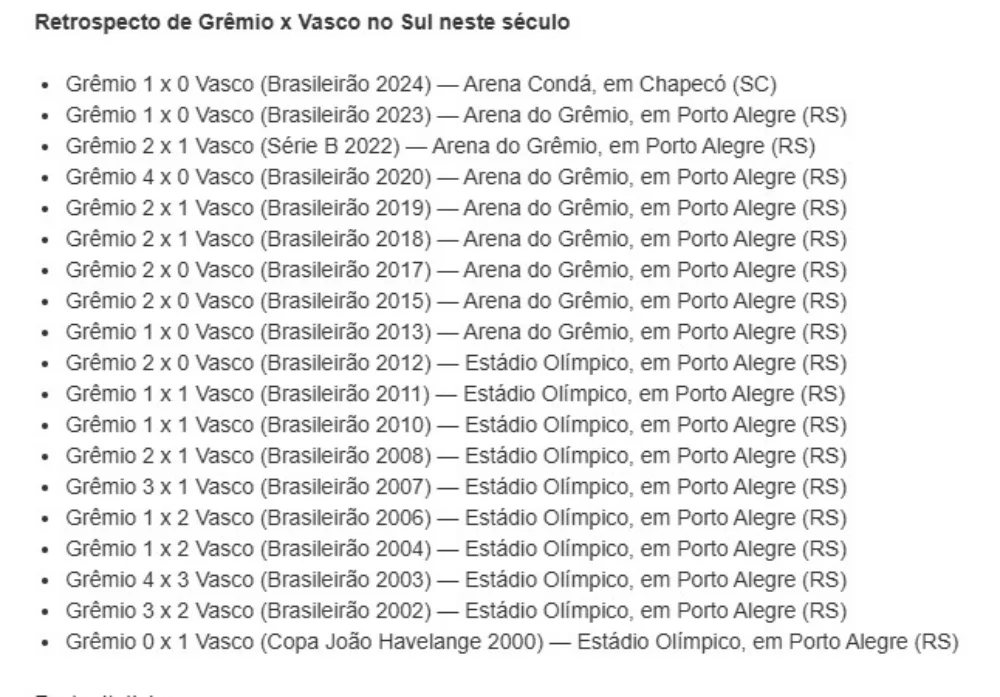 De lá para cá, foram 14 jogos, com 12 vitórias do Grêmio e apenas dois empates (ambos no Olímpico). O Vasco perdeu as últimas 10 partidas que disputou contra o Tricolor como mandante (contando o jogo em Chapecó, em 2024).