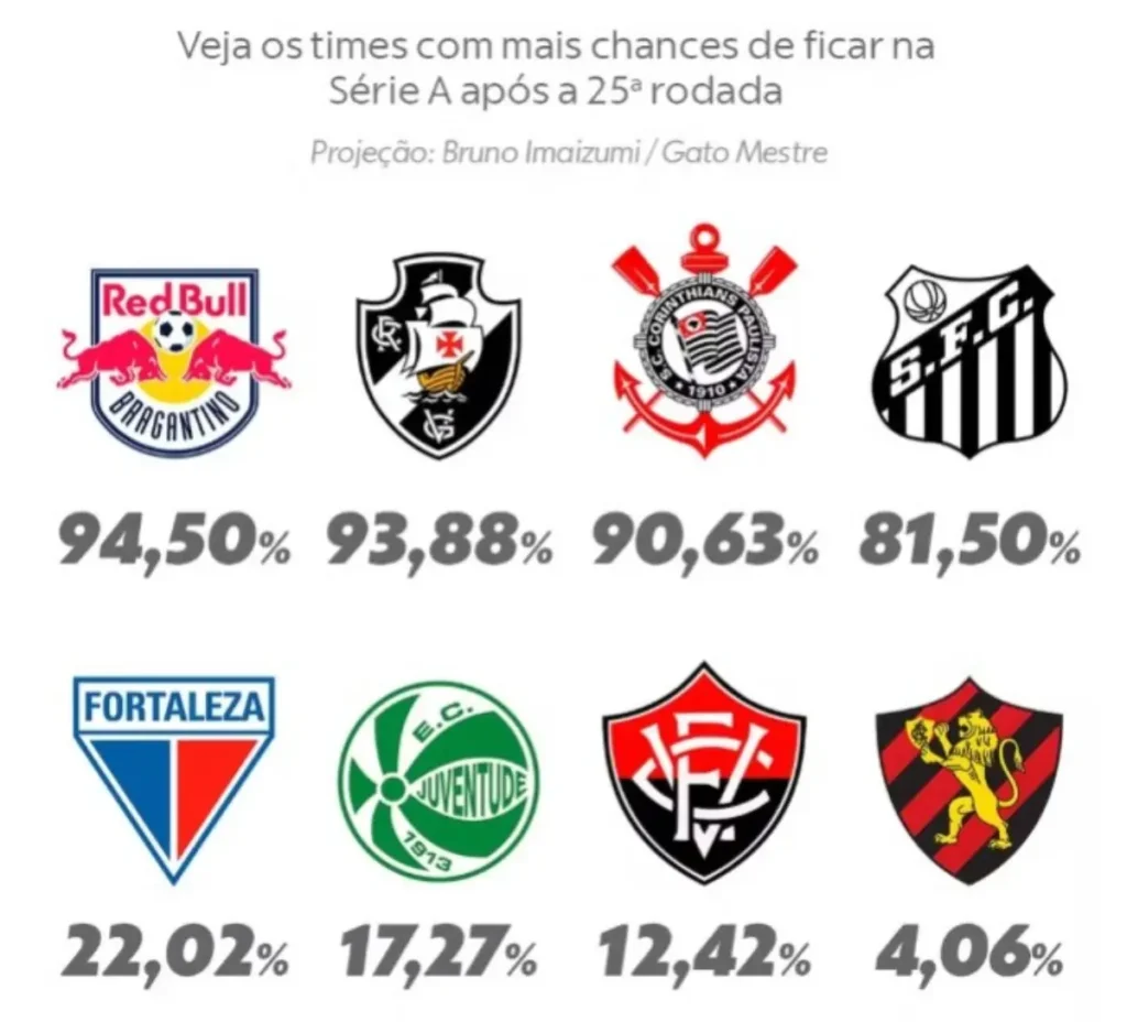 A melhor notícia é que o fantasma do rebaixamento está cada vez mais distante. Segundo os especialistas, a probabilidade de queda do Vasco é baixa. Os percentuais variam: