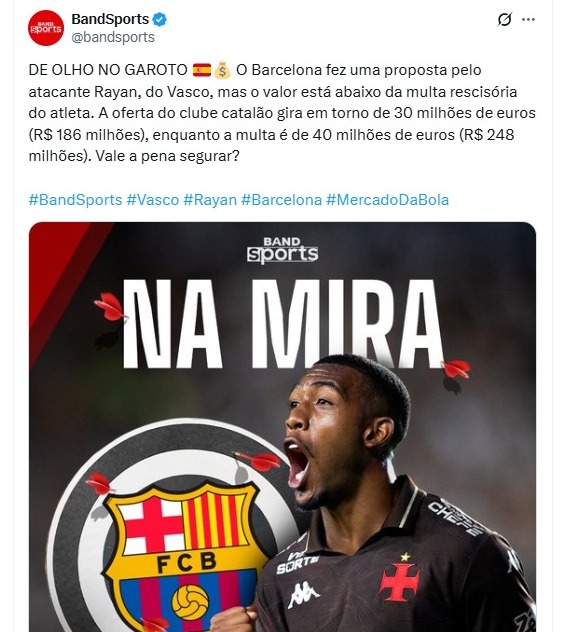 O Vasco recebeu a sinalização de até onde o Barcelona está disposto a ir por Rayan. O clube espanhol definiu seu limite financeiro em 30 milhões de euros (R$ 186 milhões). No entanto, a diretoria vascaína considera o valor insuficiente para fechar negócio.