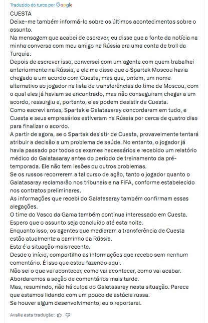 Apesar das notícias desencontradas sobre o motivo da desistência, o jornalista TurcoOsman Altunterim apurou que os mandatários do clube Russo receberam a informação de que um de seus alvos prioritários, antes praticamente descartado, estava de novo disposto a negociar e, graças a isso, eles resolveram suspender a transferência de Cuesta.