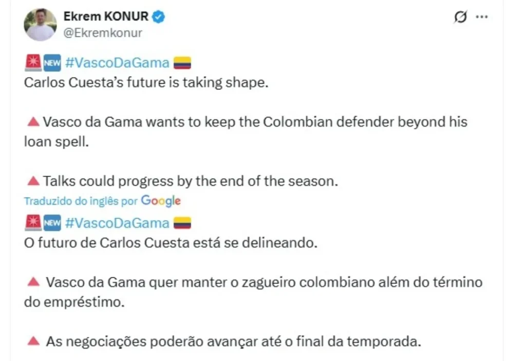 O Vasco já se movimenta nos bastidores para garantir um pilar defensivo. A diretoria cruzmaltina decidiu que quer a permanência de Carlos Cuesta. O clube iniciará negociações para comprá-lo em definitivo, segundo o jornalista Ekrem Konur.