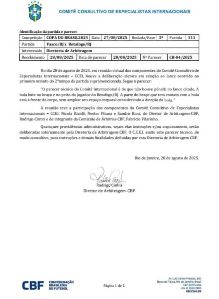 Após muita polêmica envolvendo um lance de não marcação de pênalti no jogo entre Vasco x Botafogo, disputado na última quarta-feira (27), válido pelas quartas de final da Copa do Brasil, a CBF divulgou um relatório, em conjunto com o Comitê Consultivo de Especialistas Internacionais (CCEI), explicando sobre a análise da escolha do árbitro Anderson Daronco.