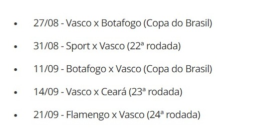 Já no próximo domingo (31), o Vasco viajará até o Recife para enfrentar o Sport, lanterna do campeonato, pela 22ª rodada da Série A. No retorno pós data FIFA, o time jogará o confronto de volta da Copa do Brasil no dia 11 de Setembro. Três dias depois, recebe o Ceará, em São Januário, em 14 de Setembro, jogo da 23ª rodada do Campeonato Brasileiro, e fecha a “quina decisiva” contra o flamengo, no dia 21 de Setembro, também pelo Brasileirão.