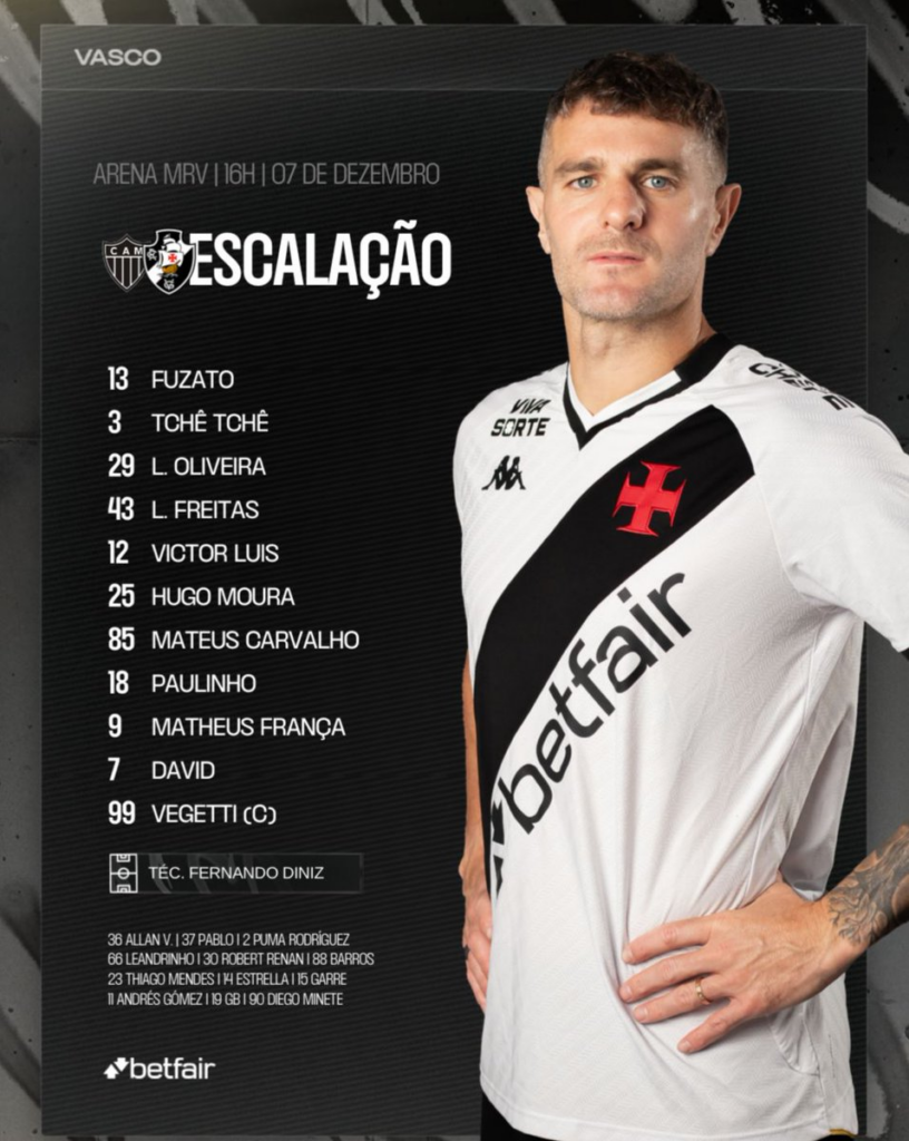 O Vasco da Gama entra em campo daqui a pouco, às 16:00h (horário de Brasília), na Arena MRV, para o confronto diante do Atlético-MG, em jogo válido pela 38ª rodada do Campeonato Brasileiro. O Cruz-maltino precisa vencer para marcar presença na Copa Sul-Americana de 2026.