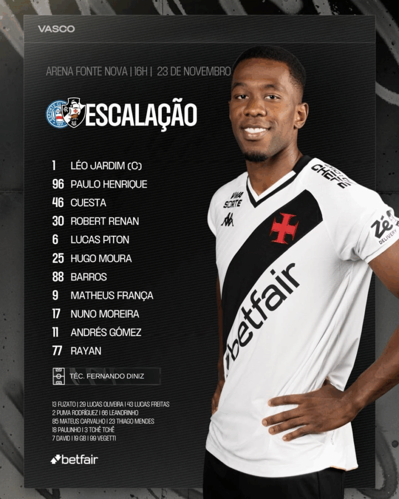 O Vasco da Gama entra em campo daqui a pouco, às 16:00h (horário de Brasília), na Arena Fonte Nova, para o confronto diante do Bahia, em jogo válido pela 35ª rodada do Campeonato Brasileiro. Vindo de quatro derrotas seguidas, o Cruz-maltino precisa buscar uma vitória para espantar a crise.