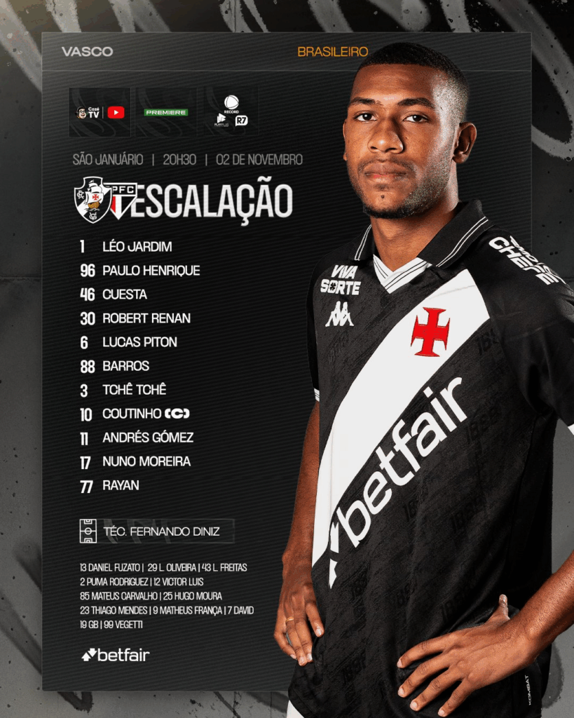 VASCO X SÃO PAULO: Veja a escalação oficial, onde assistir e arbitragem