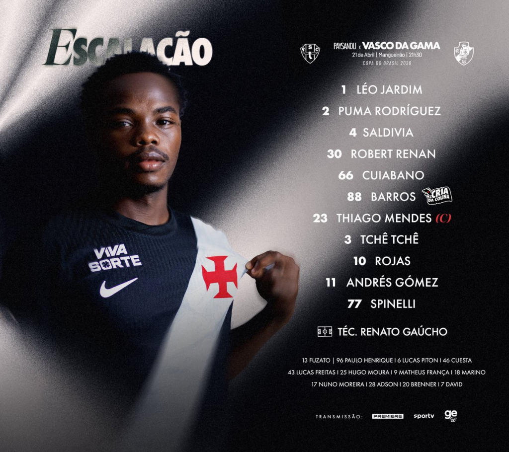 PAYSANDU X VASCO: Veja a escalação oficial, onde assistir e arbitragem
